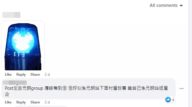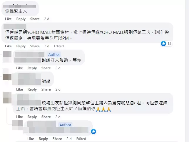 網民表示「 應該幫到佢,佢好似係元朗站下面村屋放養,識自己係元朗站返屋企」。網上截圖
