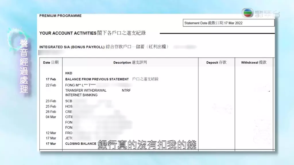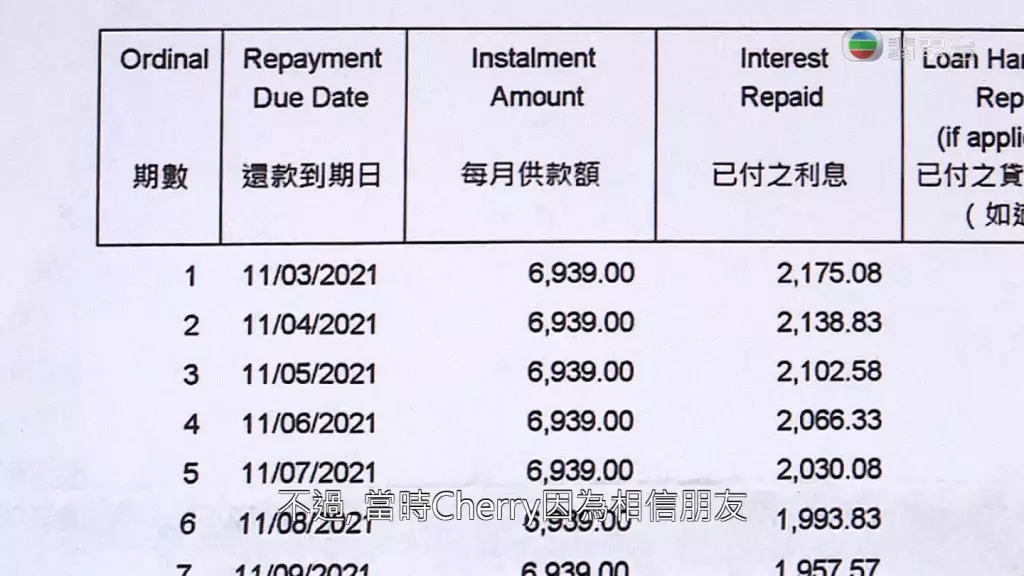Cherry及後收到自動轉賬授權的通知,銀行職員稱之後每月會有近7千元由其存款戶口,自動轉賬到一個於另一間銀行新開的戶口作為還款。