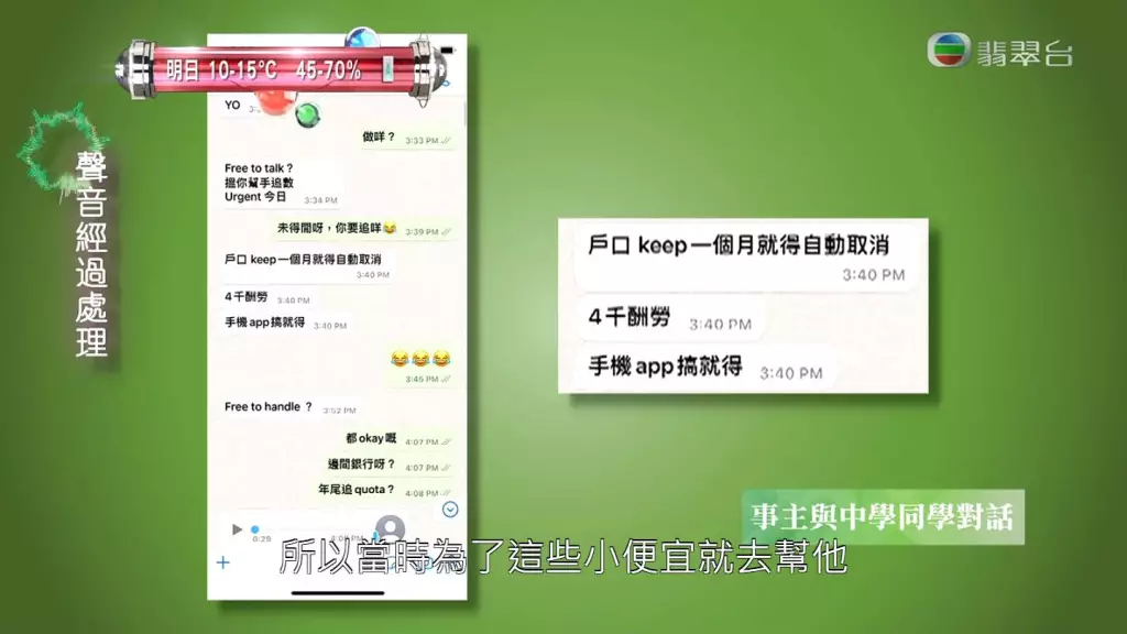 Cherry以為舊同學已將這35萬元歸還給銀行,豈料她發現自己的存款戶口開始每月被扣約7千元還款,而舊同學之後又每月都轉賬約7千元進Cherry的存款戶口。
