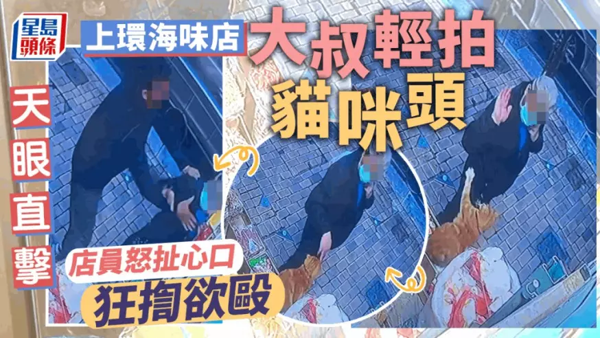有大叔在上環海味店撫摸貓咪時,疑險遭貓咪抓傷,他作勢輕拍貓頭,結果惹來店員不滿,有人衝前怒扯大叔心口狂揈欲毆。