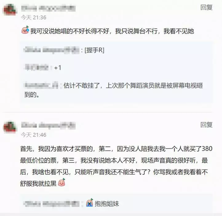 該留學生表示對於是次演唱會感到非常失望,「後邊的屏幕你不放大歌手本人你搞那些氛圍感給誰看,我旁邊的local(本地人)都說『什麼都看不到,聽歌識人』,我真的會謝,真的會失望。」她表示自己沒有批評楊千嬅的歌聲,更指楊千嬅唱得非常好聽,但舞台設計令她失望,對於有網民質疑她抹黑楊千嬅,她亦回應:「首先,我因為喜歡才買票的,第二,因為沒人陪我去我一個人就買了380最低價位的票,第三,我沒有說她本人不好,現場聲音真的很好聽,最後,我啥也看不見,只能聽聲音我還不能生氣了?你罵我或者我看著不舒服我就拉黑。」