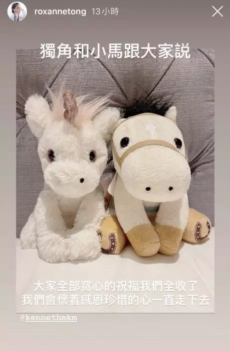 湯洛雯多次晒定情物獨角獸與小馬公仔。