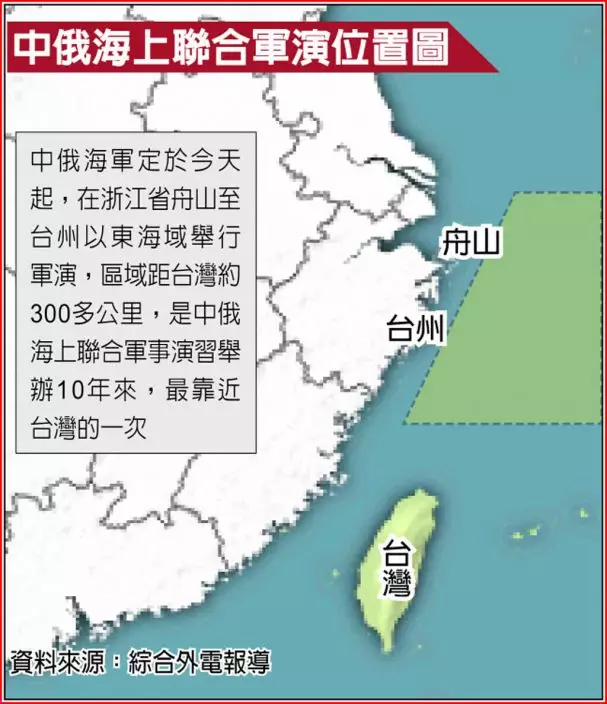 中俄兩國海軍21日至27日,將在浙江舟山至台州以東海域展開「海上聯合-2022」聯合軍事演習,雙方將派出多艘艦艇、戰機和直升機參與。該系列演習是中俄雙邊框架內規模最大的海上演習。此次軍演區域距離台灣最近僅300多公里,是雙方軍演區域10年來最靠近台灣的一次。
