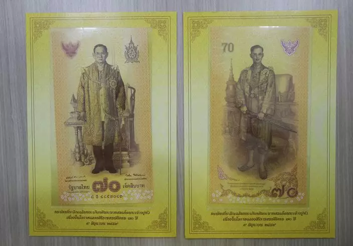 另外,泰國中央銀行發行2000萬張紀念鈔,每張面額為70泰銖(約15港元),發行價為100泰銖(約22港元)。紀念鈔正面為泰王近年站在王座前的肖像,背面則是泰王年輕時手握勝利寶劍的站立圖,背景為大王宮。 所有紀念鈔銷售收入將全部敬獻給泰王。