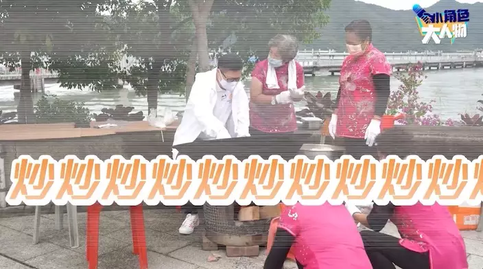 面對躍躍欲試想要一展身手的鄧sir,熱情的「四朵金花」起身在旁指導。第一個秘訣是「大力啲」,只見鄧sir大力翻炒,用力之強勁獲得金花一致好評。鄧sir幾乎要在鍋中掀起江湖,過了一陣,累到快要滴汗的他不禁發問為何還未結束,金花們說時間未到,提醒鄧sir注意用力大小。鄧sir轉頭好奇問起「阿SA」、「阿嬌」是否為真名,又問起沙頭角村長名字,同金花們親切互動,笑料十足。