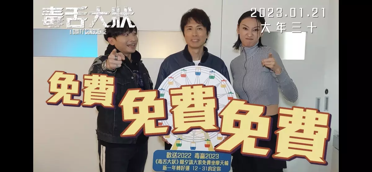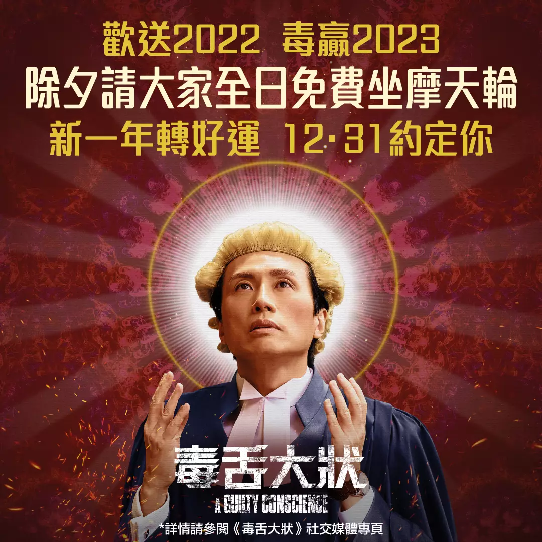 由黃子華毒舌領軍,2023農曆新年賀歲電影《毒舌大狀》,將於1月21日(大年三十)隆重上映。趁踏入新一年,毒舌團隊陪伴港人「歡送2022,毒贏2023」,在12月31日除夕,《毒舌大狀》團隊及安樂電影公司,盛意邀請全港巿民免費乘搭位於中環海濱長廊的香港摩天輪,陪伴香港巿民坐「幸運輪」轉個好運,希望為送走這三年煩悶的疫情,迎接2023,新一年好運連連。