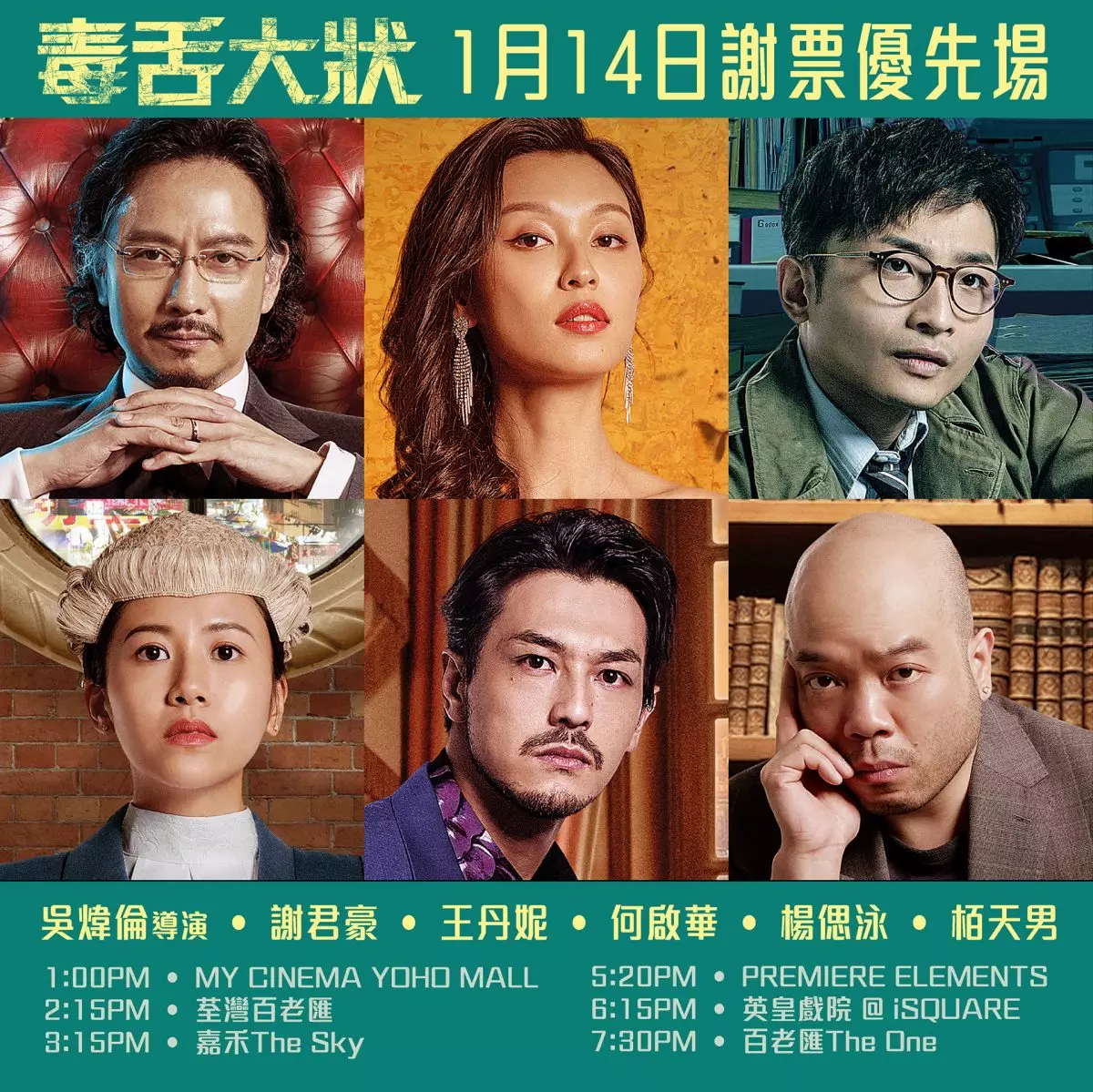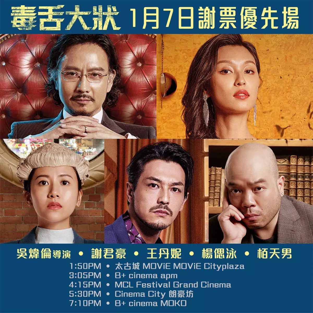 另外,為提早迎接歡欣新歲,《毒舌大狀》將於1月7及14日舉行謝票優先場,屆時戲中演員亦會現身戲院與觀眾見面,分享喜悅,與大家拜早年迎新歲。