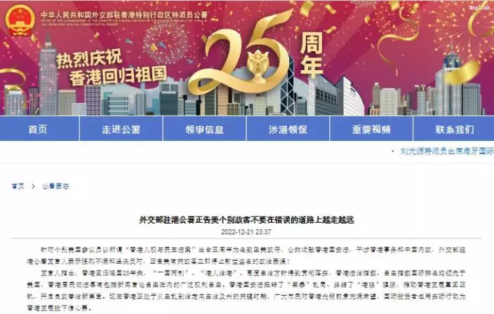 發言人指,香港回歸祖國25年來,「一國兩制」、「港人治港」、高度自治方針得到貫徹落實,香港法治指數、自由指數國際排名均領先於美國,香港居民依法享有包括新聞言論自由在內的廣泛權利自由。香港國安法扭轉了「黑暴」亂局、終結了「港獨」猖獗,推動香港發展重回正軌,國際投資者也用實際行動為香港發展投下信心票。