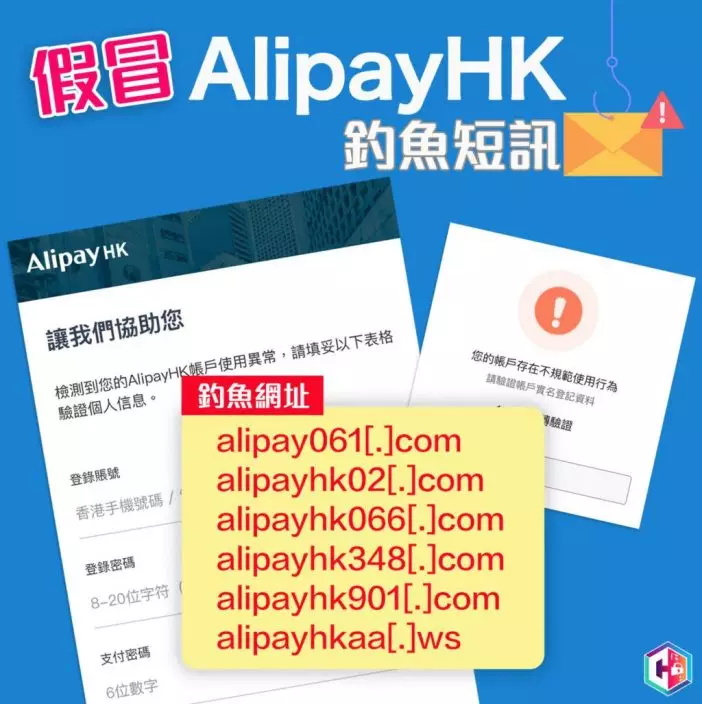 警方指騙徒繼續「轉湯唔換藥」,漁翁撒網散發短訊聲稱收訊人戶口異常,並附上連結至假網站,誘騙用戶輸登入憑證和支付密碼,其後轉走AlipayHK賬戶餘額。