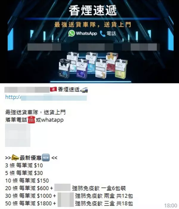 此外,有賣家以折扣推銷私煙,但凡購買20條可獲扣減600元,更獲贈強肺免疫飲品1盒共6包,購買50條可獲扣減1800元,更獲3盒共18包強肺免疫飲品。海關表示,一向採取情報主導的執法策略,從不同層面全方位打擊私煙活動,並不時在各區進行監察,加強情報蒐集,密切留意私煙活動的最新情況,如發現違法行為,定必果斷執法。