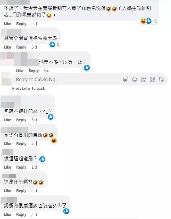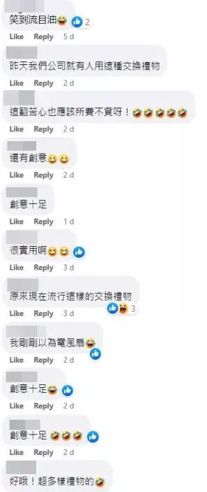回應的網友認為「電風扇形家品組合」內的禮品「價值遠超電扇」、「總價和風扇應該也沒差多少了」,並安慰「至少有實用的東西」,且明白「原來現在流行這樣的交換禮物,並已「學起來了」。