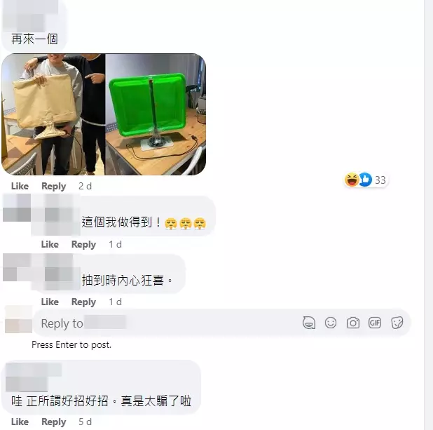 拋磚引玉成功,有網民急不及待展示自己的同系列戰利品,包括一個由托盤、廁所泵和小砧板砌成的「電腦屏幕」,指自己抽到時「內心狂喜」。另有一個大製作,由琳瑯滿目家品組合成的「電單車形家品套裝」,當中的車輪由報紙綑成,創意值與手工值均爆燈。