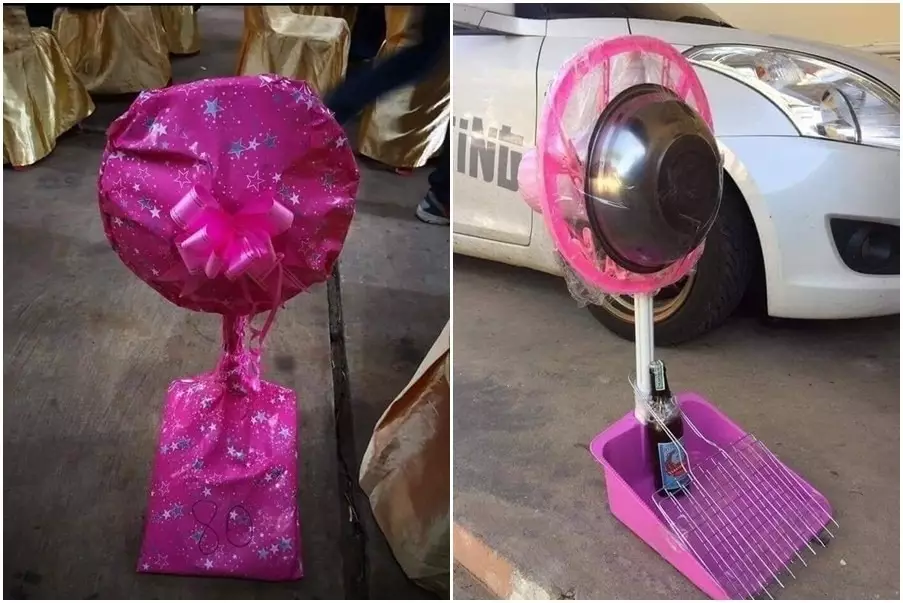 相信是來自台灣的網民以「聖誕節交換禮物,有夠哭阿~」為題,上載風扇禮物相片,見到拆開美美的包裝紙後,由臉盆、圓形晾衣架、垃圾剷、烤肉網、酒瓶等堆砌而成的風扇形狀,網民都笑翻,紛紛大讚有創意。