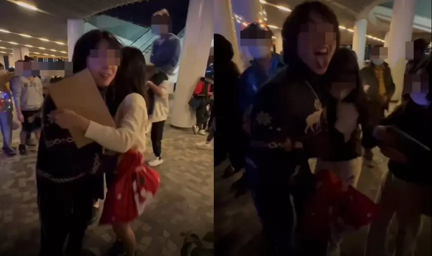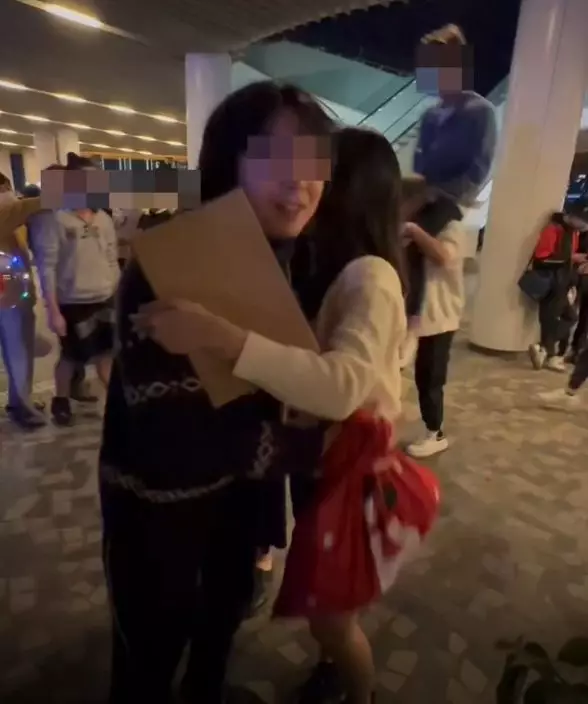 一名男子未有戴上口罩,沿路逐一與女生輕輕擁抱。影片截圖