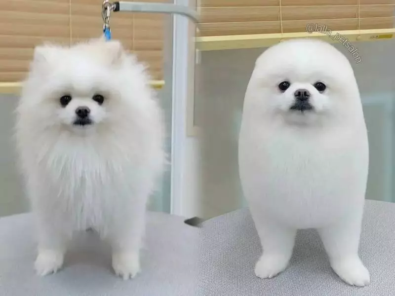 從這位狗主分享的相片可見白色博美犬美容前,身上的白毛略帶些奶油黃顏色,十分凌亂。經由美容師巧手打理過後,毛髮變得十分整齊服帖,竟意外撞樣「小海豹」。