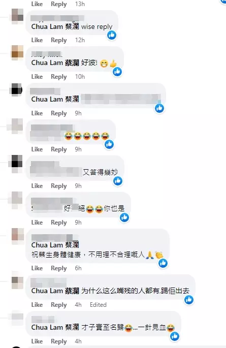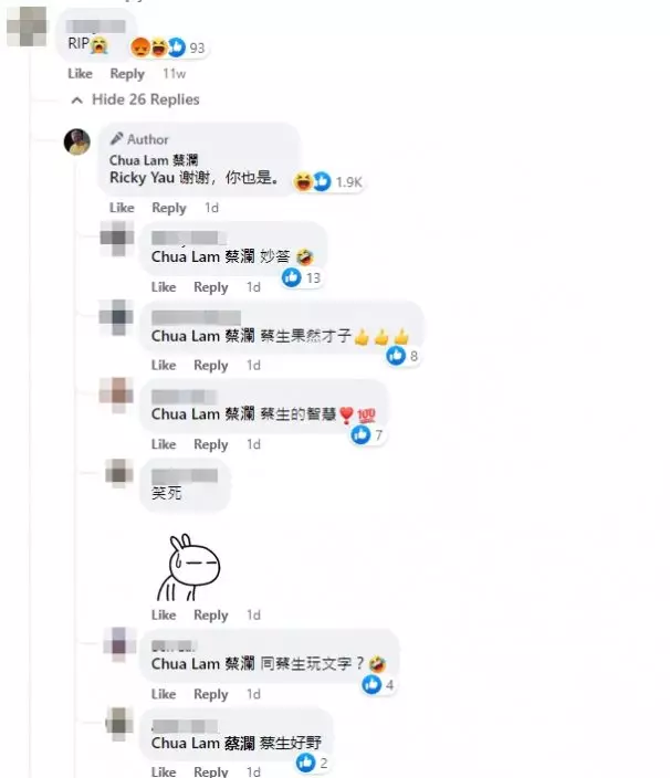 蔡瀾相隔兩個多月,突然以妙招回覆留言「RIP」的網友,引起粉絲驚歎他的智慧,紛紛留言說:「蔡生果然才子」、「蔡生真係回覆得充滿智慧」、「才子實至名歸,一針見血」、「笑死我了,太幽默」。