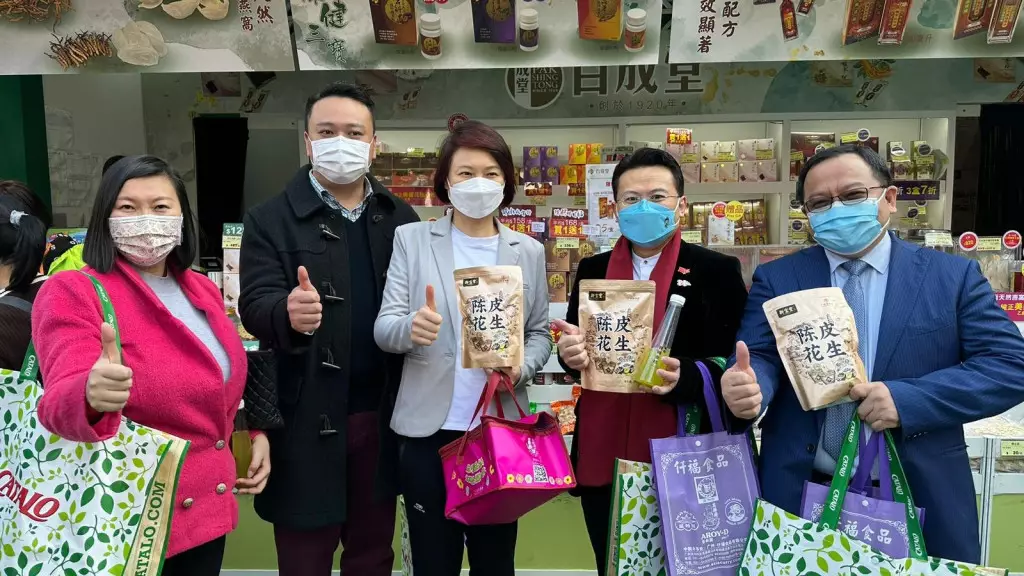 民建聯副主席、立法會議員陳勇(右二)分享他買了兩款「議員專用產品」,分別是陳皮花生,可以做「花生友」;以及五枝青梅金桔,可以「潤自己、潤其他議員」。