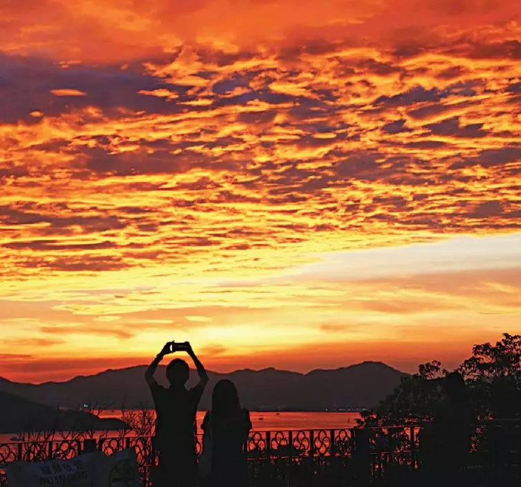 赤朱丹彤■七月曾出現黃昏「火燒雲」美景,市民爭相「打卡」留倩影。蘇正謙攝