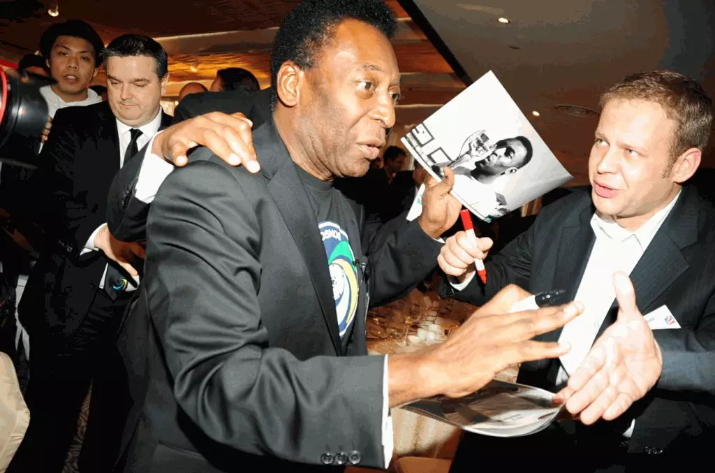 球王比利(右二)2011年在訪港之旅第2日為球迷簽名。
