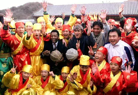 球王比利 2002年訪華,與時任中國足球隊領隊米路天奴域等合照。