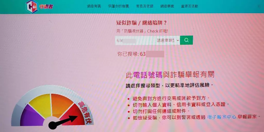 另外,記者通過警方網絡安全及科技罪案調查科支援的「守網者」網站所推出的一站式詐騙陷阱搜尋器「防騙視伏器」( https://cyberdefender.hk/ ),查核「遊X行」是否涉嫌行騙,當輸入對方提供的轉數快收款電話號碼,結果顯示「此電話號碼與詐騙舉報有關」,又顯示最高級別的紅色警示,代表「高危有伏」。