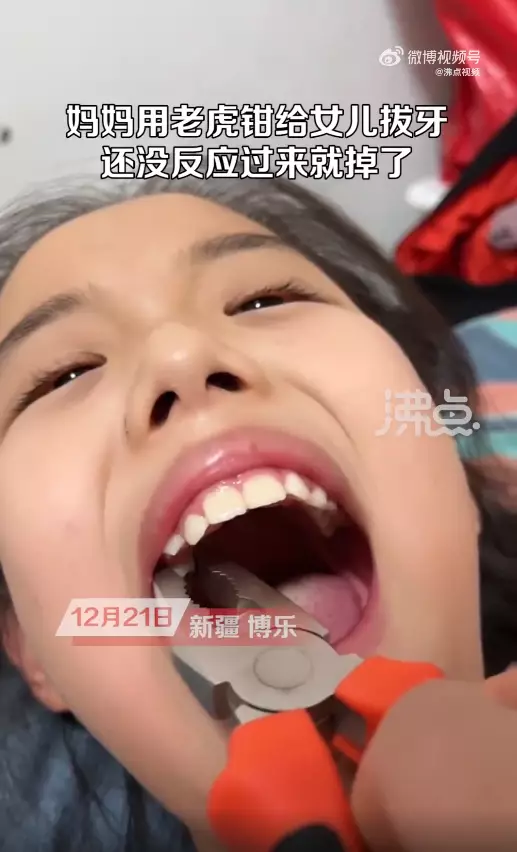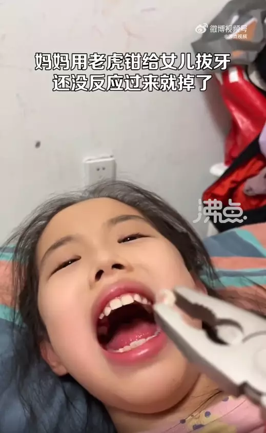 只見影片中,媽媽「手起鉗落」,將略顯有些大的鉗子放入女兒的嘴裡,然後找到了「肇事的牙齒」,一開始先左右搖晃以便快點脫落,而不到幾秒鐘,甚至女兒還沒來得及哭著喊痛的時候,牙齒已經被順利拔落了。