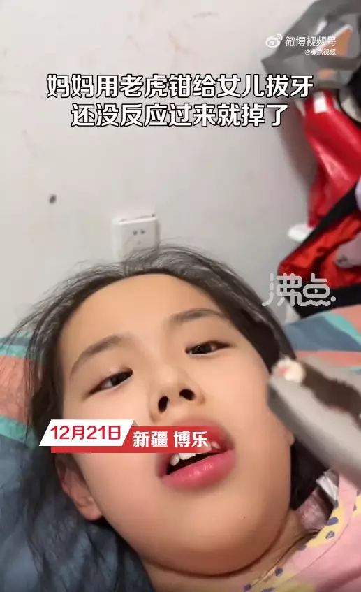 據《沸點視頻》報導,在新疆博樂的一個小女孩正在經歷換牙期,有一顆牙齒變得有些鬆動,要掉不掉的狀態讓她相當苦惱。為了讓女兒的牙齒可以快點脫落,媽媽竟在家裡找了一把老虎鉗,直接幫女兒將牙拔掉。