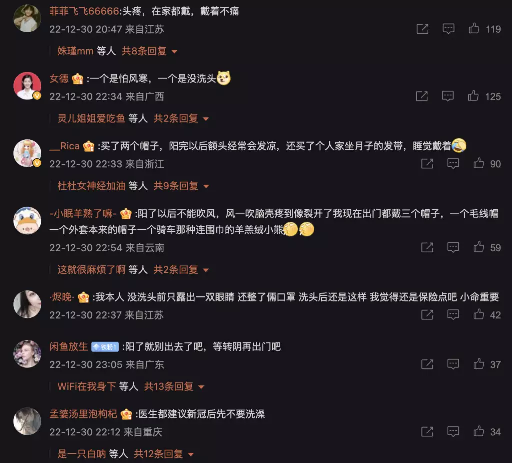 影片引起不少網友的共鳴,紛紛評論道,「風一吹就頭暈,今天剛買了頂帽子」、「陽了之後,那叫一個怕風,風一吹感覺鉆腦袋瓜子疼」、「孕婦效應可能是」、「全國人民都在坐月子,剛出月子還是要註意保暖的」。