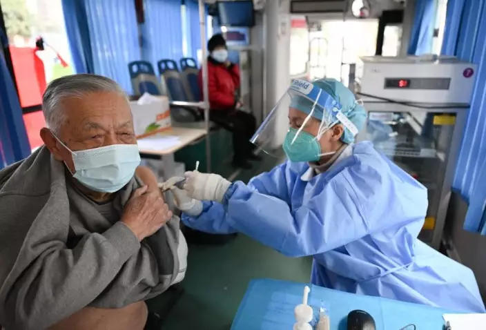 12月12日,在廣州市荔灣區廣鋼新城便民疫苗接種車上,醫務人員為老年居民接種新冠疫苗。12月12日,在廣州市荔灣區廣鋼新城便民疫苗接種車上,醫務人員為老年居民接種新冠疫苗。