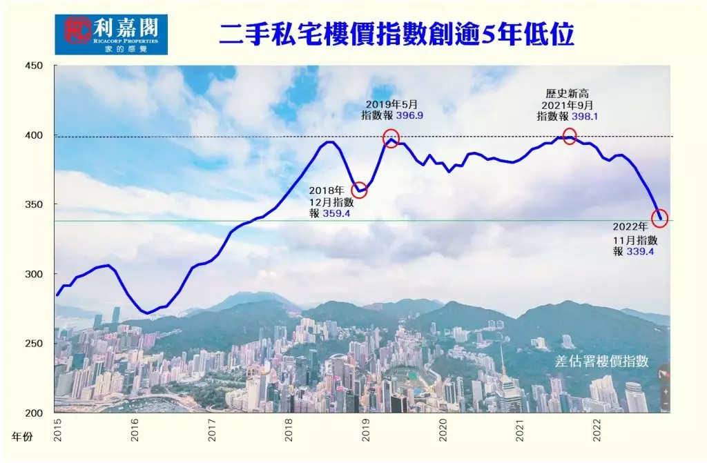 差估署上周公布的最新數據顯示,2022年11月份私人住宅售價指數報339.4點,較10月的351.1點持續下跌3.33%,連跌6個月兼創自2008年12月以來的168個月(即14年)最大單月跌幅。2022年首11個月樓價累跌13.84%,而比起2021年9月份的歷史高位398.1點,更累跌14.75%。