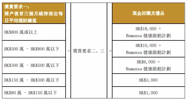 全新「理財金賬戶」客戶符合獎賞要求,尊享高達HK$18,000現金回贈及Humansa健康啟動計劃乙份 (價值HK$3,900)。