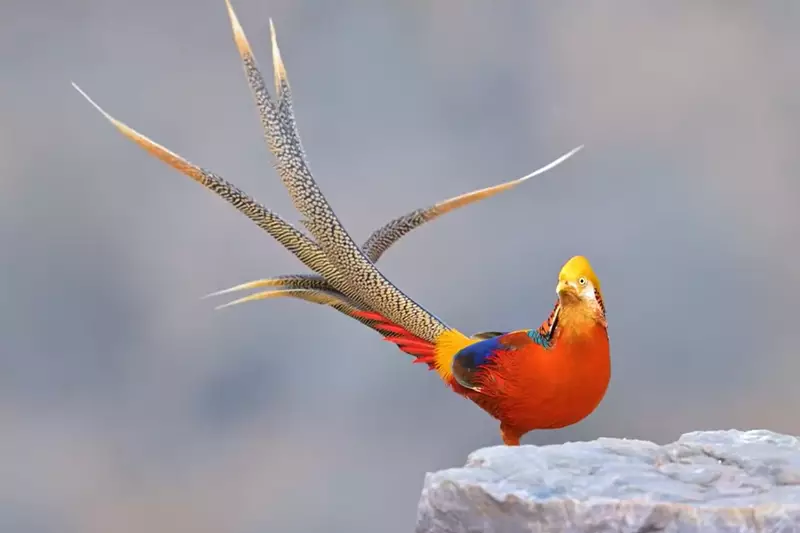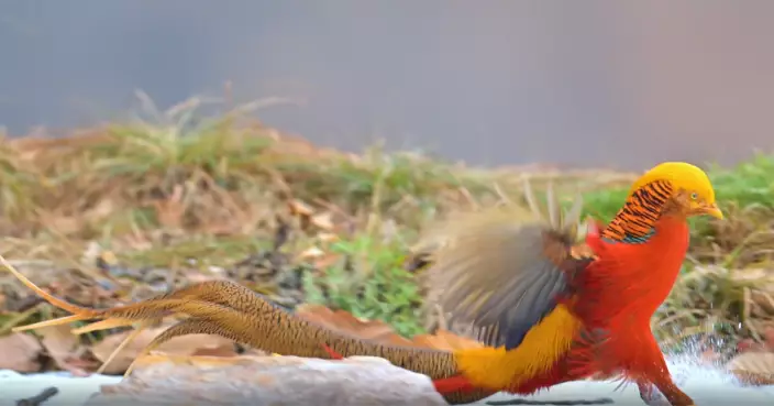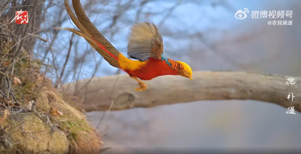 據瞭解,紅腹錦雞為國家二級保護動物,其顏色極其獨特,頭部和尾端都呈現貴氣的明黃色,腹部和腳部都為金橘色,最特別的要數牠的尾巴,由藍色、明黃色、金橘色等相互交映,尾巴末端更猶如點點火焰,讓拍下這一幕的攝影師都忍不住驚呼,「飛天火鳳凰出現了」!