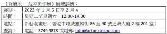 新藝潮畫廊宣佈呈獻香港資深畫家沈平近年作品展《香港地》,展覽於 2023 年 1 月 5 日開幕,持續至 2023 年 2 月 4 日。