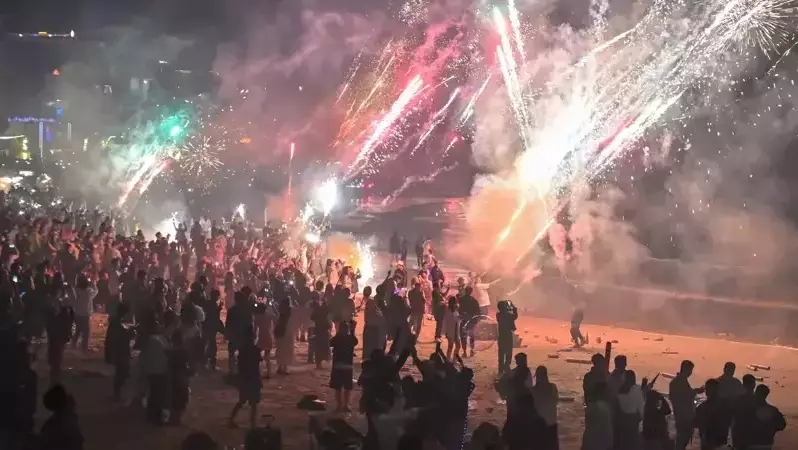 元旦期間遊客在海南三亞海邊燃放煙花。