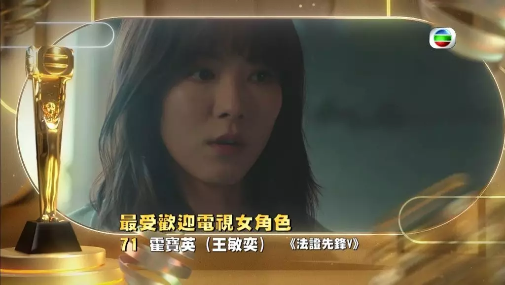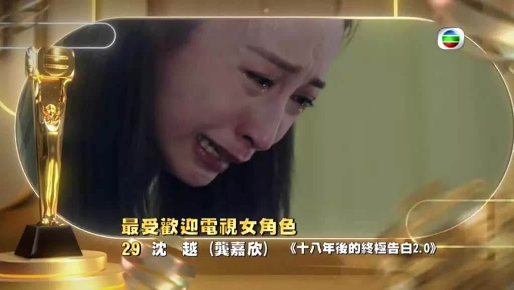 「捱返嚟」的龔嘉欣雖然臨門撻Q未能入圍十強爭「視后」,不少觀眾都為她感到不值,因她在《十八年後的終極告白2.0》飾演的沈越,與譚俊彥的一段愛恨交纏十多年的感情,到最後揭開二人之間有私生女,再到喪女一幕,龔嘉欣以多層次演繹心痛到爆喊,牽動不少觀眾情緒。要奪得「最受歡迎電視女角色」可謂睇高一線。