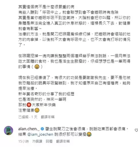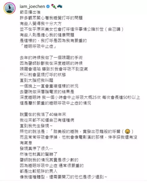 陳喬恩直言活了40多年,從不知道自己有這種病,直到老公揭發:「醫師說我的情況其實是很少數的,因為睡眠呼吸中止症,通常很嚴重的,都是比較肥胖的男人,像我這種體型,還需要開刀的他也是很少遇到」,雖然聽起來病情不輕,但陳喬恩在文中寫得很輕鬆,更講解手術過程:「就是開刀把喉嚨扁條線切掉、把睡眠時會塌陷的地方的肉拿掉」,而她接受手術後,兩星期不能說話,以及一個月無法進食固體的食物,但打趣指自己一舉兩得:「活生生餓瘦的」。陳喬恩7日再在限時動態留言,感謝大家的關心:「我已經康復了。」
