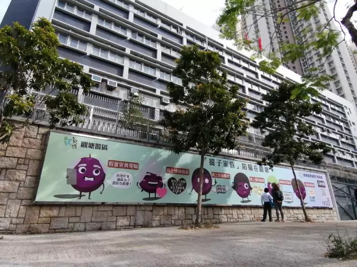 「提子家族」的大型橫額已張掛在觀塘警署外牆,加強宣傳功效