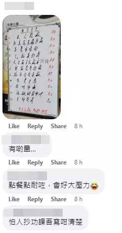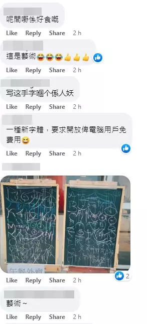 另有人笑說「好似畫鬼腳」、「識睇睇成塊,唔識睇條界」、「一種新字體,要求開放俾電腦用戶免費用」。由於讀出餐牌的字讓人傷神,有好心網民放出翻譯版本: