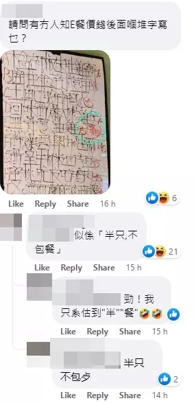 另有尋根究柢的網民追問「請問有冇人知E餐價錢後面嗰堆字寫乜?」,再有看懂的高人回覆「半只,不包餐」。