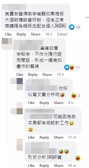 有從事設計工作的網民分析「筆者故意字貼字,不作分隔行距同間距,形成一幅有如畫作的餐牌」。另有熟門路的網友知道有關餐廳位於小西灣富欣花園,還指「呢手字好似係個餐廳個阿叔經理寫,佢寫得好靚呀」。