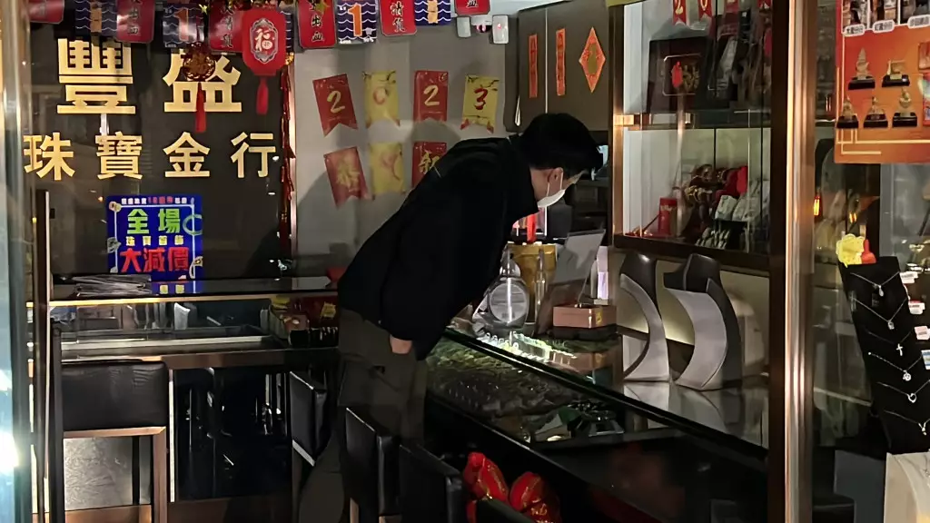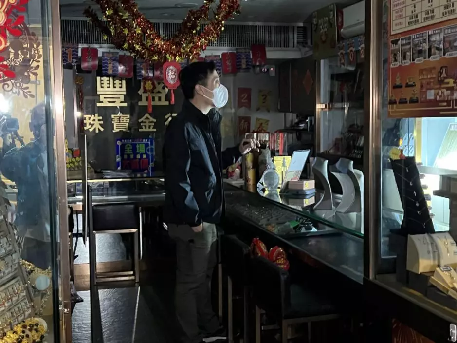 西九刑事部警司鍾雅倫在珠寶金行內調查。