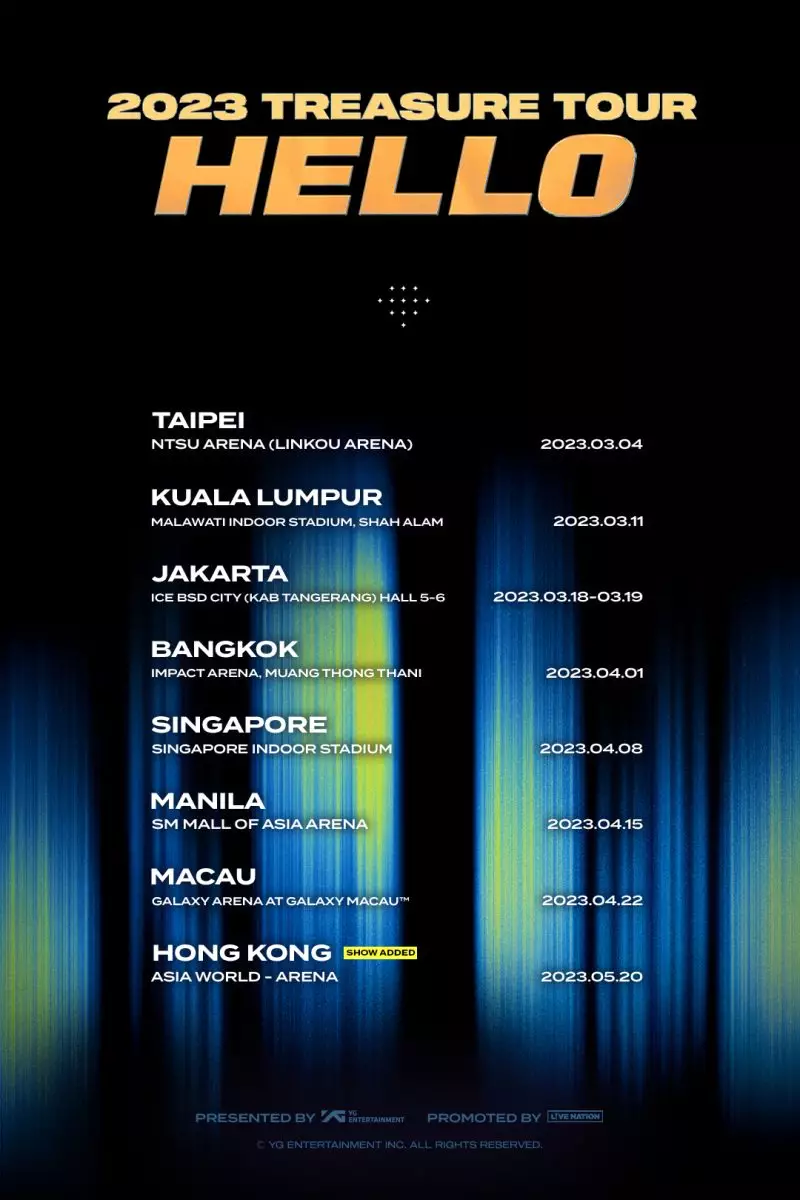 《2023 TREASURE TOUR [HELLO]》巡迴演唱會將由2023年3至5月於八個亞洲城市舉行(網上圖片)