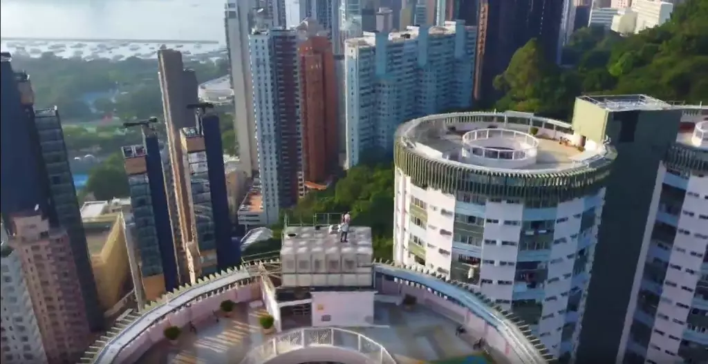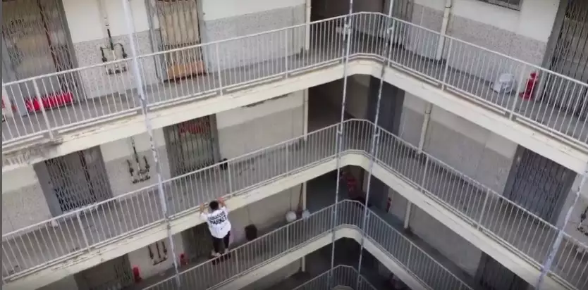 他挑戰由井字型公屋24層天井欄杆爬至地下的最快時間。(IG影片)
