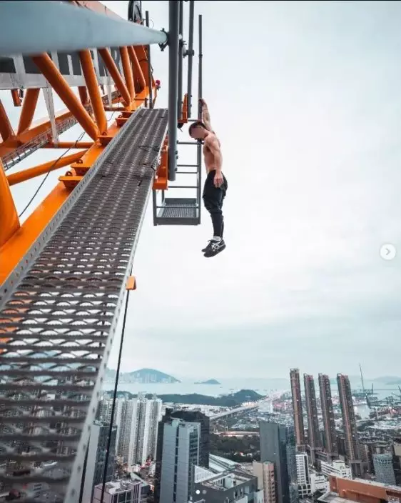 涉事青年花名「唐狗」,曾闖入不同地盤爬上天秤頂進行單手扶杆的「飛躍道」凌空動作。(ig圖片)
