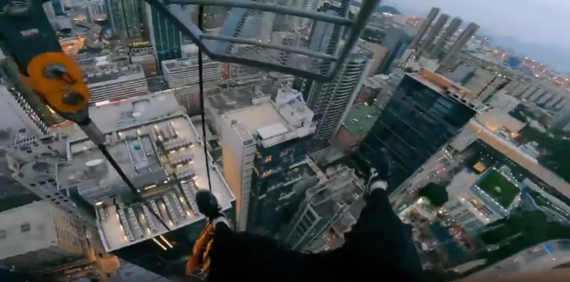 從影片可見他身處數百米下的空中,單手扶杆,另一手曾做出v字手勢。(ig圖片)