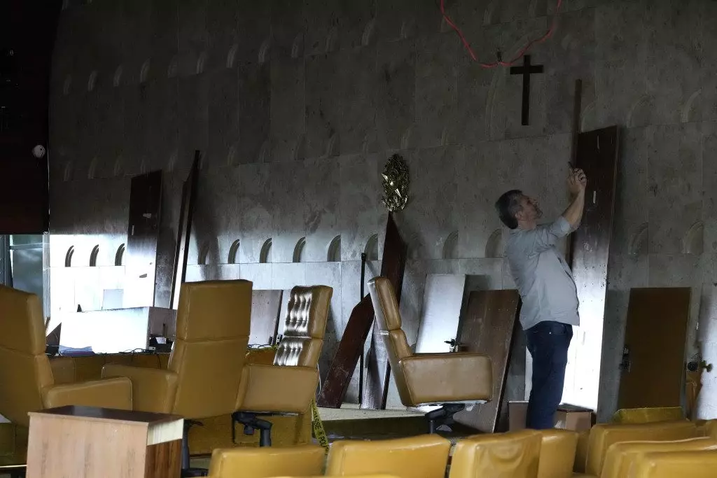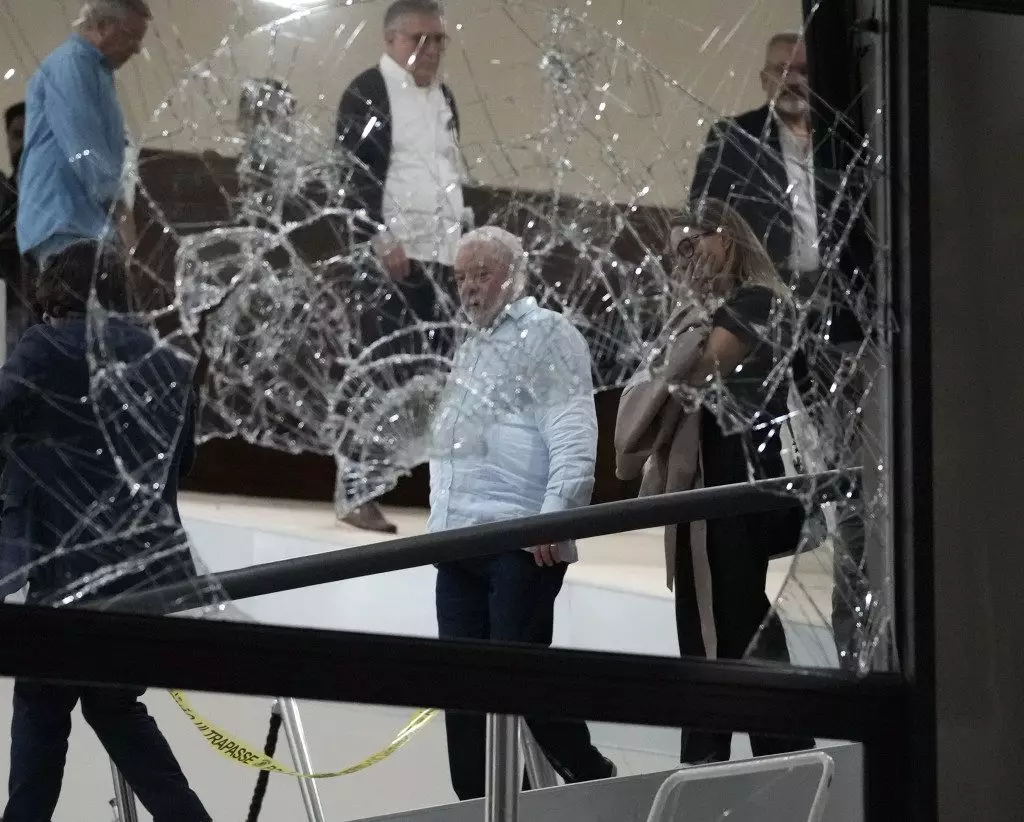盧拉視察被衝擊的建築物,表明會對強闖國家權力機構的人作出懲罰。AP