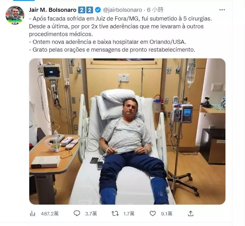 巴西前總統博索納羅上傳在美國佛州的醫院病床照片。