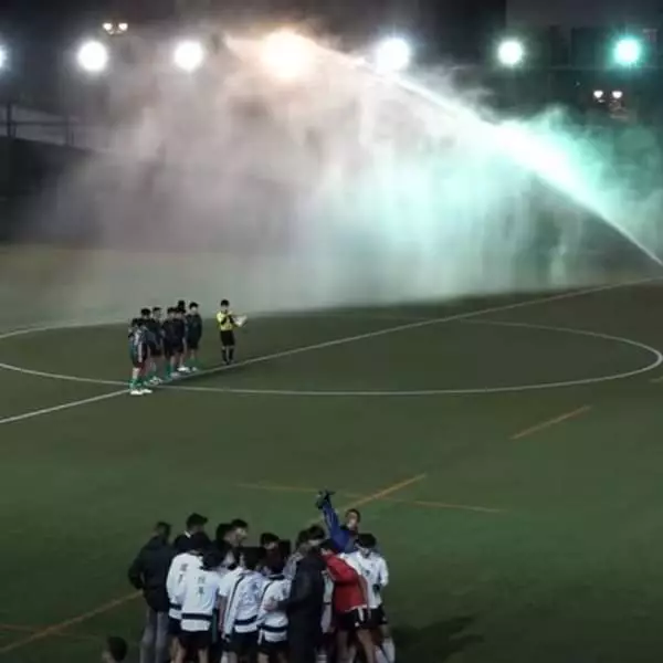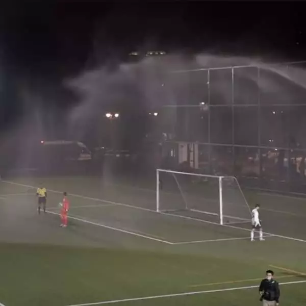 球場在黃昏6時準時灑水保養,直至十二碼結束仍在灑水。網上圖片