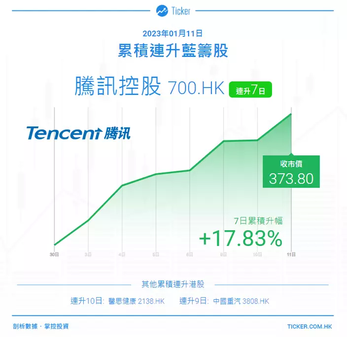 騰訊(00700)連升7天,累升17.83%,今日升3.15%,報373.8元,成交33.42億居首。