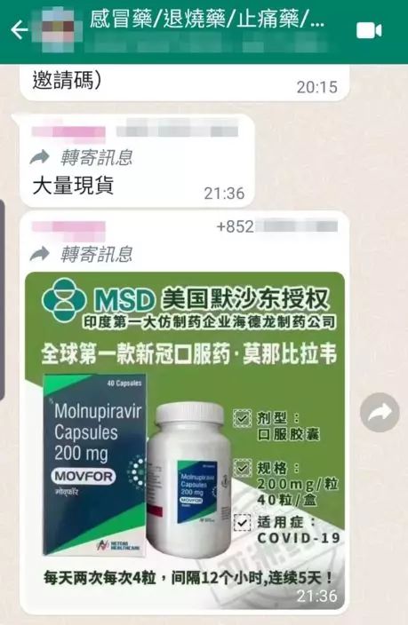有人在Whatsapp群組叫賣印度版「Molnupiravir」新冠口服藥。